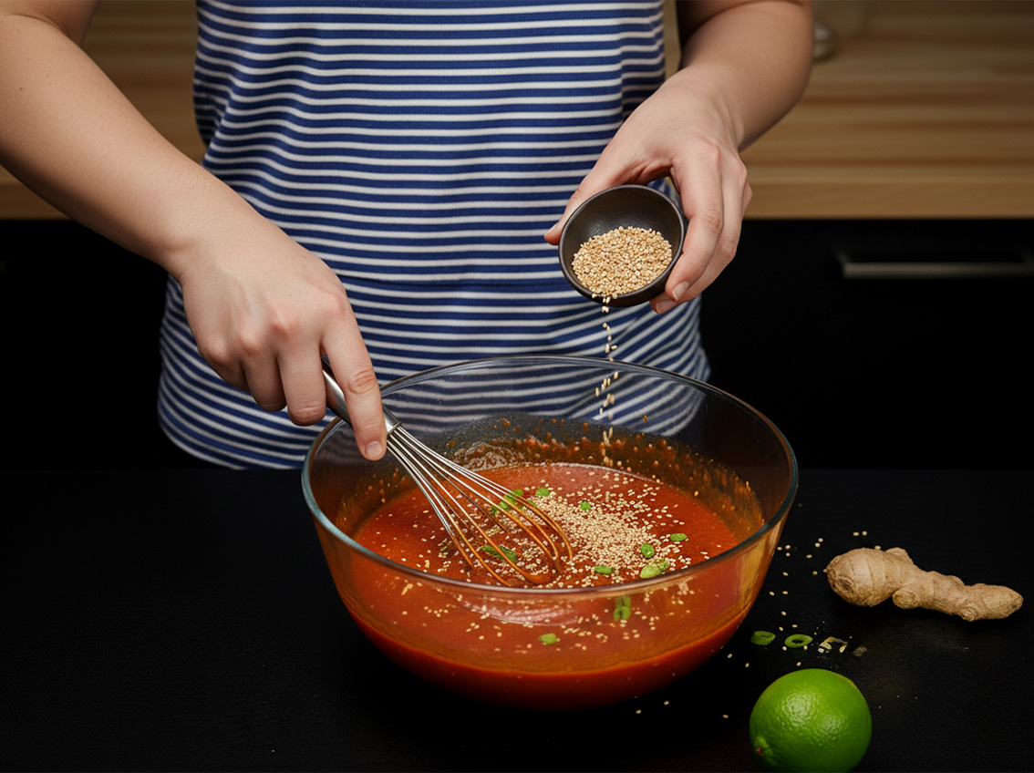 Whisk together the gochujang, soy sauce, lime juice, lime zest, honey, toasted sesame oil, grated ginger, and toasted sesame seeds.