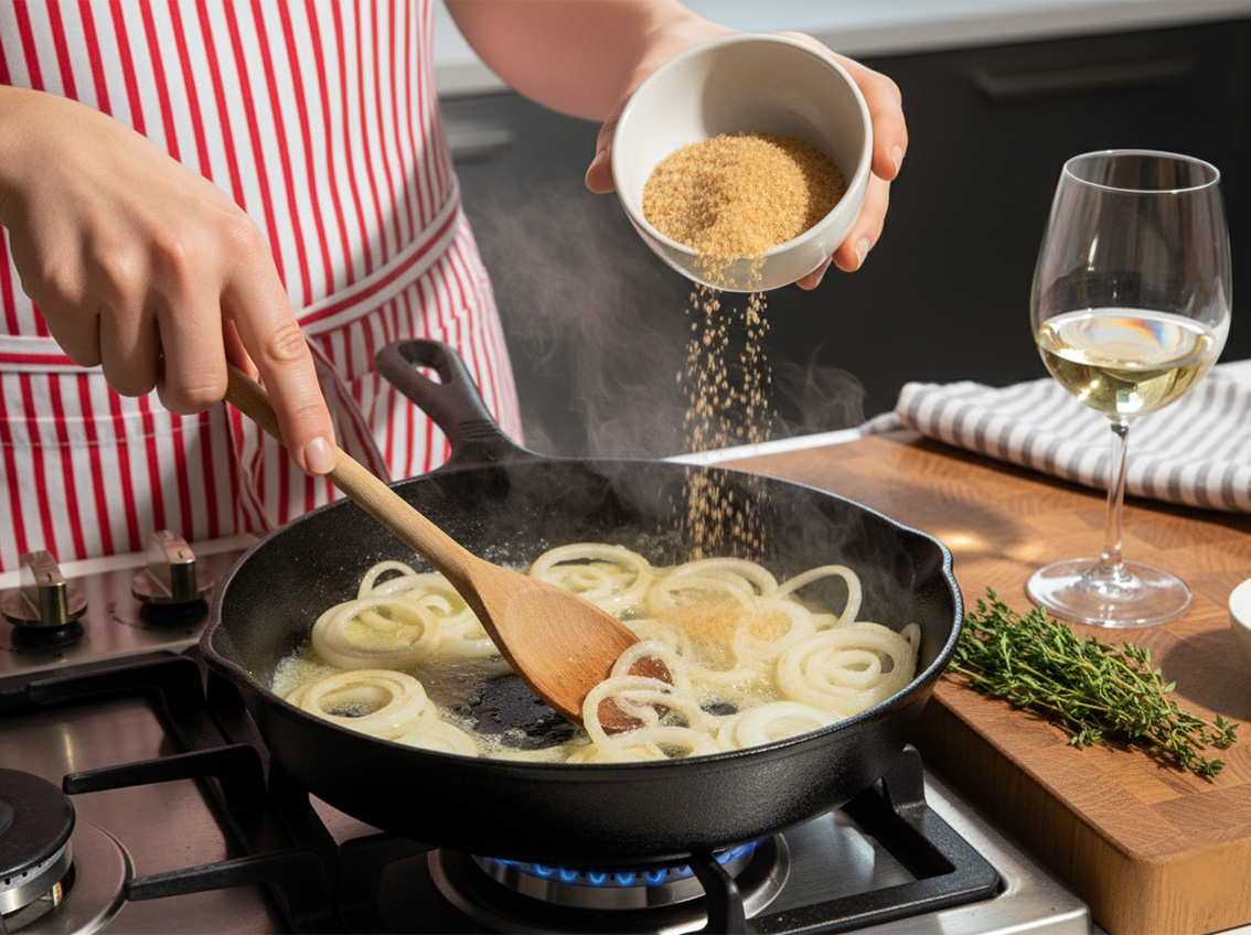 Add the brown sugar and thyme leaves. Continue to cook for another 10 minutes until the onions are golden and caramelized.