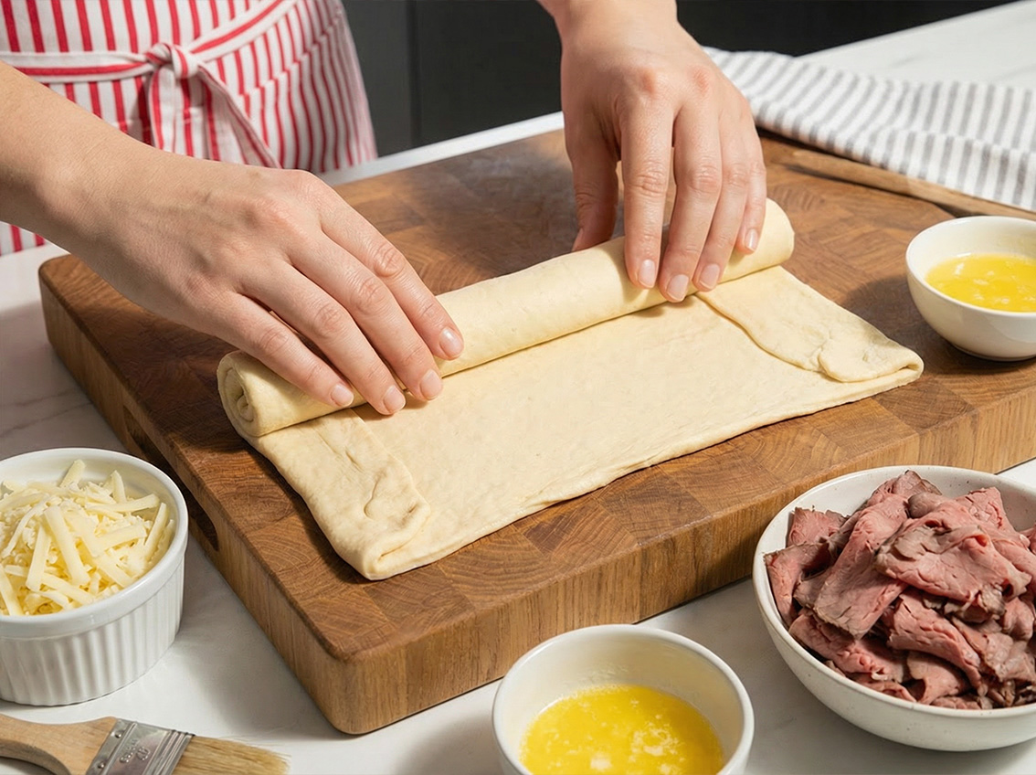 Roll out the crescent dough and pinch the seams together to create a large rectangle.